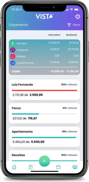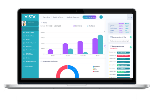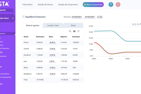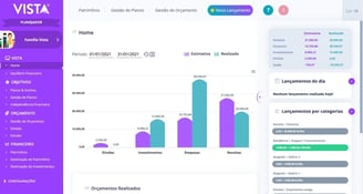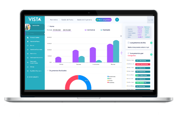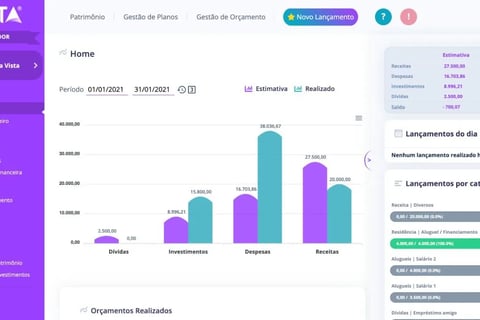 Interface intuitiva. Visão geral dos gastos, receitas, dívidas e investimentos. Análise gráfica das estimativas e realizações.